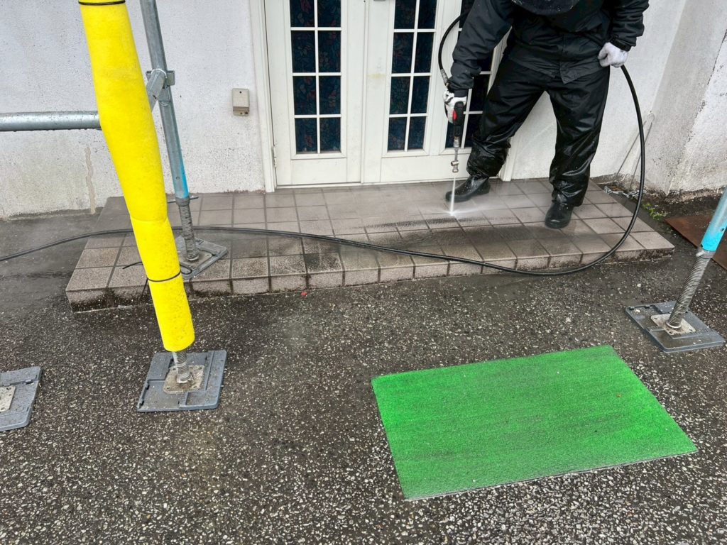 高圧洗浄は、塗装前の下地処理として高圧水流で汚れや劣化した塗膜を除去する重要な工程で、コケ・カビ・ホコリなどを落とし塗料の密着性を高め耐久性を向上させます。