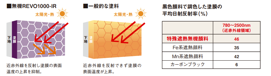 遮熱性とは「熱源となる太陽光の近赤外線領域の光を反射し、表面の温度上昇を抑制する機能のこと」です。フッ素REVO1000-IRで採用されている黒色の特殊遮熱無機顔料は、従来の黒色顔料よりも近赤外線を反射しやすい。だから塗膜表面の温度上昇を抑えることができます。