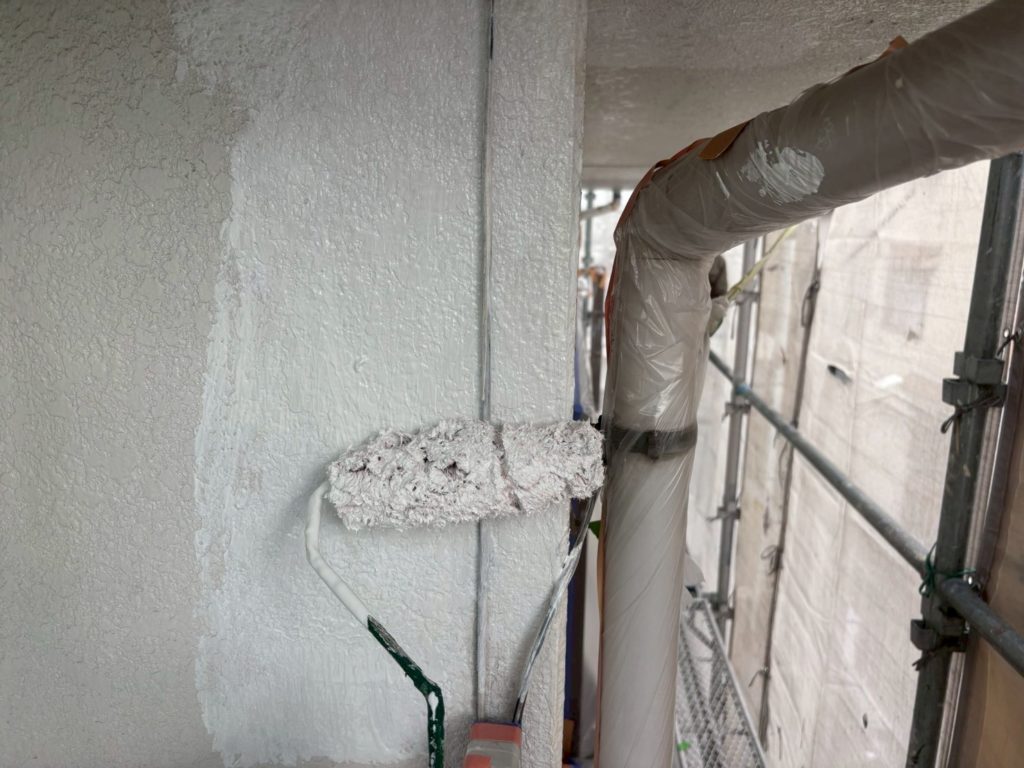 今回は築年数や建物の構造、外壁の素材を基に、下塗り1回目は「浸透性シーラー」、下塗り2回目は「微弾性フィラー」を使用しました。